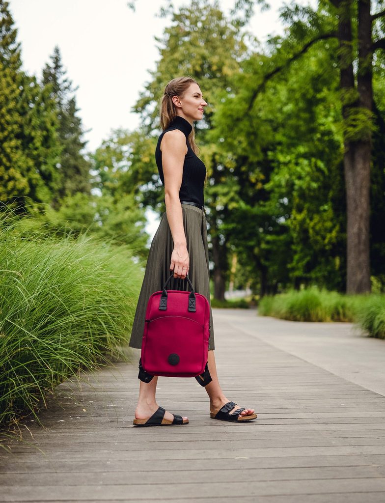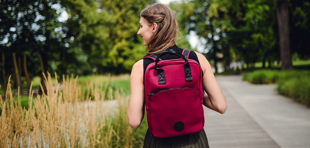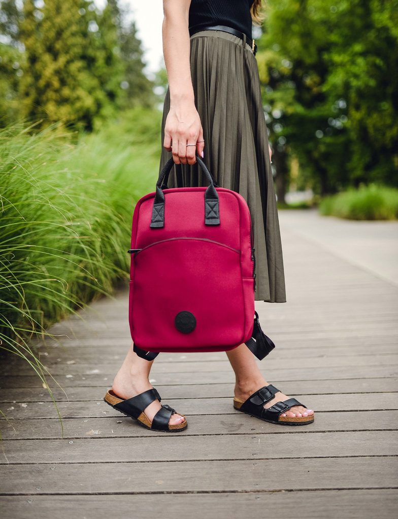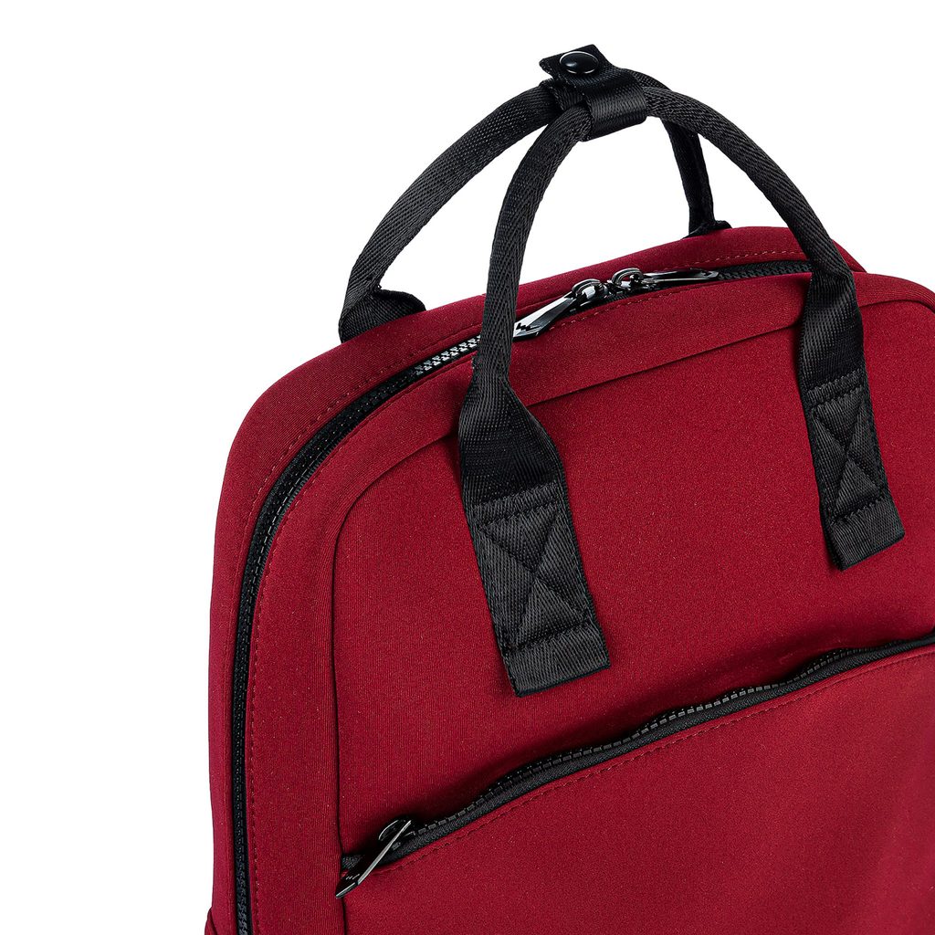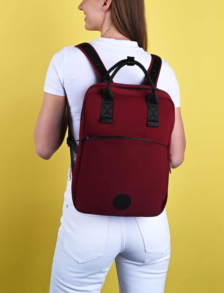 Dámský batoh je vyrobený z odolného neoprenu. Ramenní popruhy jsou nastavitelné. Hlavní komora je uzavíratelná dvoucestným zipem. Uvnitř je polstrovaná kapsa na notebook a dvě otevřené přihrádky.